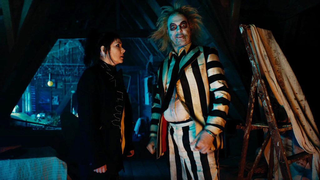 Sono passati 34 anni dal primoBeetlejuice: un film”puro”, nato dall’immaginazione di un Tim Burton appena trentenne e ancora turbato dalle proprie immaginazioni. Il film dell’88, difatti, assieme all’estro sfrenato, al desiderio di commedia bizzarra e slapstick e alla natura orgogliosamente artistica e cinefila, possedeva una malinconia elegiaca che ne costituiva l’essenza. C’è, nel primo Beetlejuice, una radice filosofica e poetica, l’inestirpabile consapevolezza della finitezza umana e della separazione tra mondo dei morti e mondo dei vivi; quella stessa, sorridente tristezza che si respira nell’aldilà di film come Heaven can wait (1943) di Ernst Lubitsch o A Matter of Life and Death (1946) di Powell e Pressburger. Nel 1988 Burton giocava con la morte, vi opponeva una figura come Beetlejuice a sfidare, in forme di giovanile surrealismo, ogni tabù sul cupio dissolvi, sull’idea della fine come paura (i Maitland) o desiderio (Lydia Deetz); ma nel film aleggiava un rimpianto, la lacrima versata sulla tomba, il desiderio di un impossibile ritorno alla vita (emblematizzato dai silenzi della dolcissima coppia dei Maitland).