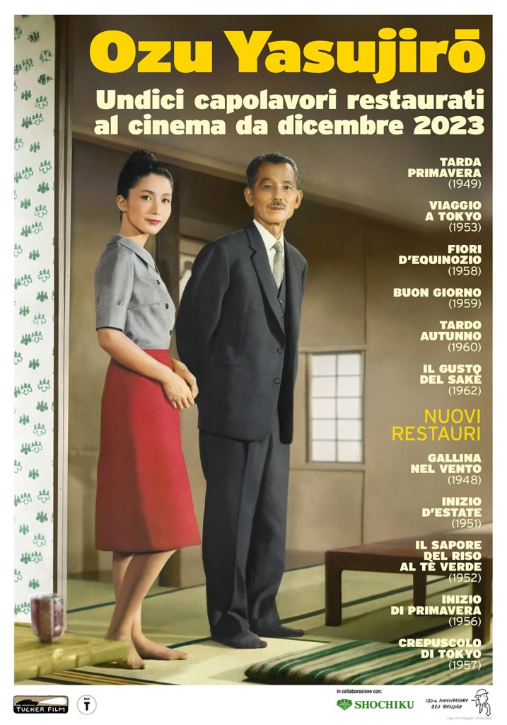 Una nuova “dedica a Ozu” in occasione dell’anniversario: la Tucker porta al cinema, in versione restaurata, Tarda primavera (1949), Viaggio a Tokyo (1953), Fiori di equinozio (1958), Buon giorno (1959), Tardo autunno (1960) e Il gusto del sakè (1962), cui si aggiungono anche i meno noti Una Gallina nel vento (1948), Inizio d’estate (1951), Il sapore del riso al tè verde (1952), Inizio di primavera (1956) e Crepuscolo di Tokyo (1957).